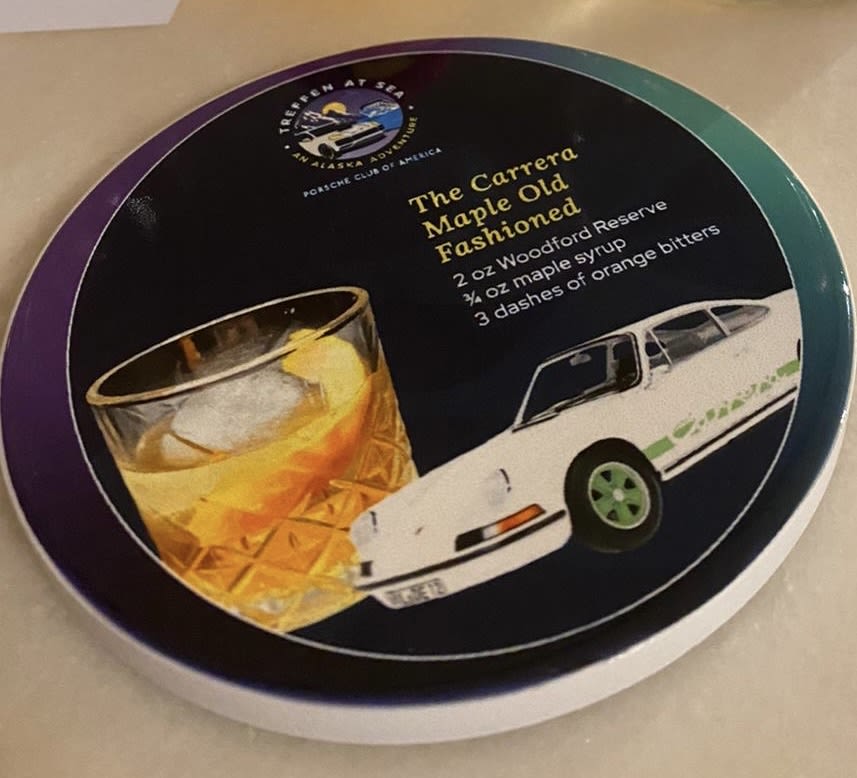 Finally, it was cruise day! Jeff and I were on a six-month road trip in our Macan, and we needed to find secure parking for it while we were on the ship. Luckily, there is parking for cruise ship passengers at the National Guard Armory in Seattle. We felt like the Macan would be safe there for a week. A shuttle bus took us easily to the cruise terminal. The Majestic Princess is huge and flashy! We opted for a balcony room to have a view and fresh air throughout the cruise. After exploring the ship, we visited one of the many bars to order a special Porsche themed cocktail and to get a collectable PCA coaster commemorating Treffen at Sea. There were four different coasters, and over the week, PCA members had fun trying to collect them all, trading with other members, and finding a bar on the ship that had their one missing coaster.